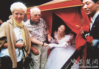 一家民居客棧內(nèi),美國(guó)攝影師約翰·雅格與相戀十多年的日本女朋友在嗩吶聲的祝福中,共拜天地……