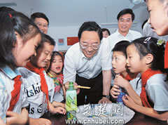 6月1日,武漢市武昌區(qū)為民小學。兩棵高大的榆樹在小小的院子灑滿了濃陰,一群孩子活蹦亂跳玩著游戲。省委書記俞正聲滿面春風地來到了孩子們中間。