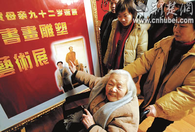 “這是特意為您準(zhǔn)備的生日禮物!”年過六旬的盧永瀚攙扶著92歲的母親,在根雕、油畫面前仔細(xì)講解!斑@個(gè)根雕是壽字!”孫女插話說:“就是祝您長(zhǎng)壽,活過100歲!”慧老太太邊看邊比劃著,樂得合不攏嘴,用濃重的江浙口音說:“好、好!”