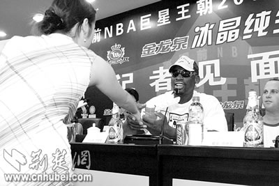 “大蟲”似乎不為所動(dòng),拿起行李,在保安的保護(hù)下向外走。記者們忙起來(lái)了,兩位來(lái)自電視臺(tái)娛樂(lè)頻道的記者拿著話筒,沖到羅德曼面前,踮起腳跟,不斷用英語(yǔ)發(fā)問(wèn)。