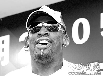 七分鐘后,前NBA巨星羅德曼出現(xiàn)在人們的視野里。他顯得有些疲倦,白色球帽遮住了那大半個(gè)五顏六色的后腦勺,不過(guò)那張有些冷酷的臉,還是讓人很快認(rèn)出,這就是那個(gè)我行我素的“大蟲”羅德曼。