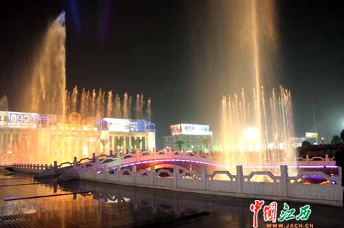 百米長的音樂噴泉伴隨著《中國人民解放軍進(jìn)行曲》、《走進(jìn)新時(shí)代》等雄壯的樂曲翩翩起舞