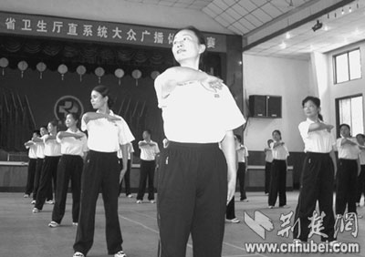 昨日下午,湖北省衛(wèi)生系統(tǒng)直屬11家醫(yī)院派出代表隊,參加全省舉辦的第九套廣播體操比賽。據介紹,新體操在傳統(tǒng)廣播體操的基礎上,引入了武術、踢毽等元素,可有利促進全身循環(huán)、精神傳導等。圖為省腫瘤醫(yī)院代表隊在表演。