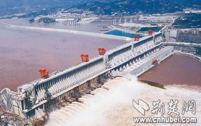 三峽工程建筑由大壩、水電站廠房和通航建筑物三大部分組成。大壩為混凝土重力壩,壩軸線全長2309.47米,壩頂高程185米,最大壩高181米。設(shè)有23個泄洪深孔,最大泄洪能力可達102500立方米/秒。電站壩段位于大壩兩側(cè),共裝機26臺,單機額定容量70萬千瓦的水輪發(fā)電機組,總裝機容量為1820萬千瓦,年發(fā)電量847億千瓦時。通航建筑物包括永久船閘和升船機。永久船閘為雙線五級連續(xù)梯級船閘。單級閘室可通過萬噸級船隊。
