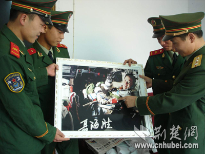 昨日,武警襄樊市支隊(duì)官兵來到航天英雄聶海勝家中,慰問聶媽媽,踏訪英雄的成長足跡。從墻上取下聶家珍藏的聶海勝的照片,武警官兵無不為這個戰(zhàn)友自豪。
