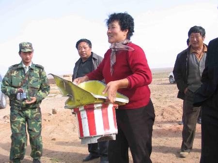 記者在搜索現(xiàn)場(chǎng)看到,從四面八方趕來(lái)的牧民群眾個(gè)個(gè)都有所獲。“哈呀,人們常說(shuō)天上掉餡餅,這不應(yīng)驗(yàn)了?”牧民張金虎指著自己撿到的一堆殘骸,興奮地開(kāi)著玩笑。牧民烏云還向記者炫耀,她和丈夫?yàn)趿裉焯匾馄鹆藗(gè)大早,在家焚香默默祝愿神舟六號(hào)飛船試驗(yàn)成功,所以今天他們撿到的殘骸最多,能裝滿滿一車(chē)。