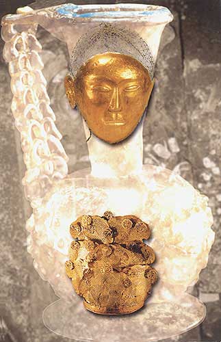 連綴銀絲網絡金面具:斂葬用具(上,面具長21.7厘米)