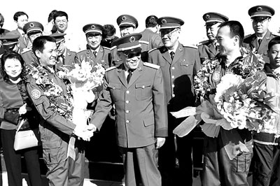10月17日上午,剛剛結(jié)束太空飛行、返回祖國(guó)懷抱的神舟六號(hào)載人飛船航天員費(fèi)俊龍和聶海勝乘專機(jī)飛抵北京。中共中央政治局委員、中央軍委副主席、國(guó)務(wù)委員曹剛川到機(jī)場(chǎng)迎接。圖為曹剛川與兩位航天員親切握手。 新華社發(fā)