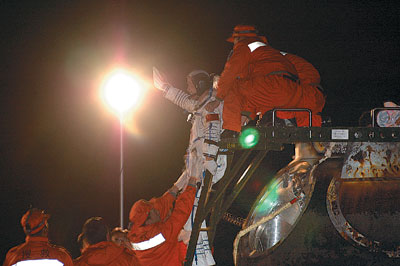 費(fèi)俊龍、聶海勝隔著舷窗,在向人們招手———返回艙內(nèi)柔和的燈光,映著他們的微笑。這一刻,距他們離開(kāi)大地4天又19個(gè)多小時(shí),他們的總行程為325萬(wàn)余公里。