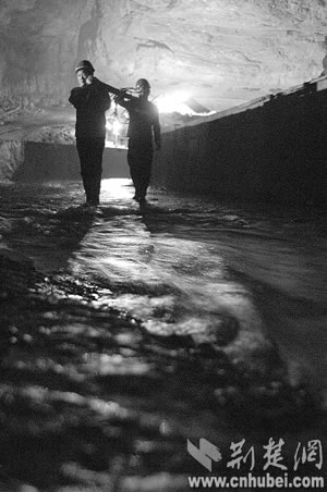 寂寞的蝙蝠第一次接待了人間來客,沉睡萬年的巖溶洞穴第一次迎來了觀者。但黑暗陌生的世界還是讓堂堂男兒們感覺了一絲陰森恐怖。他們曾聽當?shù)匕傩諅髡f,洞里有巨蟒,所以至今沒人敢進洞。“抓緊時間測量!”來不及恐懼,他們?yōu)樽约汗膭,因為這里隨時可能發(fā)生漲水、墜落等危險?上,第一次經(jīng)驗不足,手電筒的電池很快用完了,一行人只得互相攙扶著,摸索出溶洞!昂髞,我們又進去了7次,終于測出了暗河的具體位置和流向!狈轿奈湔f。