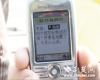 用戶:ymcbz 今天上午8時45分左右,我們還以為起了大風……有的人已經跑到樓下:是不是有地震? 五樓的小涂說:太陽能水管在擺動……前樓的小王說:窗簾斜擺,風鈴發(fā)聲! 家里魚缸的水晃出來了! 縣檢察院正在開會,桌上的茶杯晃動,大家都往樓下跑。 感謝荊楚網,快速告訴了我們事實的真相!