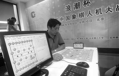 中國象棋特級大師柳大華在與計算機(jī)的對弈中。(新華社發(fā))