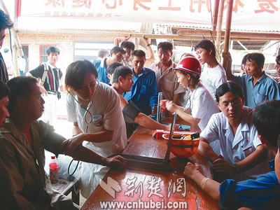 15日,參加武鋼工程建設(shè)的百余位農(nóng)民工兄弟,樂呵呵地接受了中國一冶電裝公司武鋼項(xiàng)目部為他們免費(fèi)進(jìn)行的體檢。浠水工程隊(duì)民工朱宗杰說:“這兩年來,社會(huì)各界對農(nóng)民工的關(guān)心很實(shí)在!