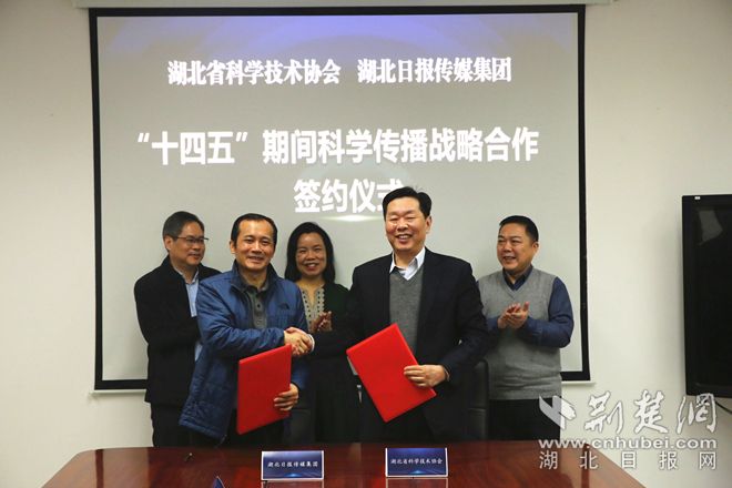 荊楚網(wǎng)客戶端—荊楚網(wǎng)消息(記者謝頤、陳雅俊 通訊員安明山)普及科學(xué)知識,倡導(dǎo)科學(xué)方法,傳播科學(xué)思想,弘揚(yáng)科學(xué)精神。1月27日,湖北省科學(xué)技術(shù)協(xié)會與湖北日報(bào)傳媒集團(tuán)簽訂“十四五”期間科學(xué)傳播戰(zhàn)略合作協(xié)議。協(xié)議明確:雙方聚焦主責(zé)主業(yè),充分發(fā)揮各自優(yōu)勢,推進(jìn)“十四五”期間全面深入合作,增強(qiáng)科學(xué)傳播的影響力和覆蓋面,為實(shí)現(xiàn)湖北省2025年公民科學(xué)素質(zhì)建設(shè)目標(biāo)提供有力支撐。