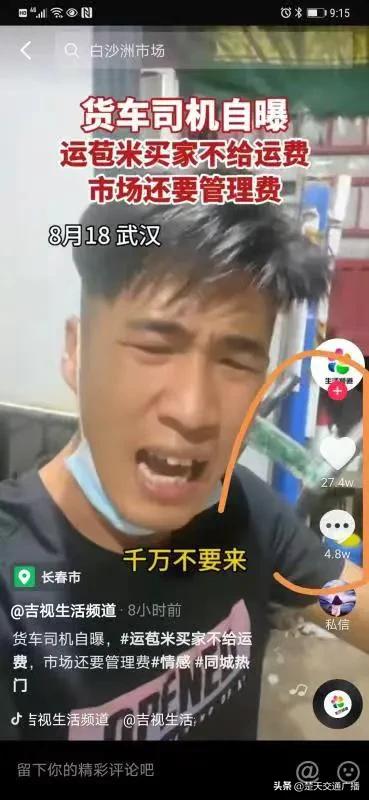 8月18日至19日,網(wǎng)民在網(wǎng)上發(fā)布多條反映“貨車司機(jī)自曝運(yùn)玉米買家不給運(yùn)費(fèi)市場(chǎng)還要管理費(fèi)”的抖音視頻,視頻中一名青年男子口述,其投訴對(duì)象為武漢白沙洲大市場(chǎng)。