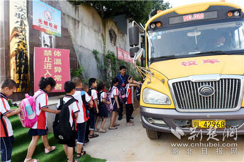 小學(xué)生在老師的指引下乘坐校車 通訊員 供圖