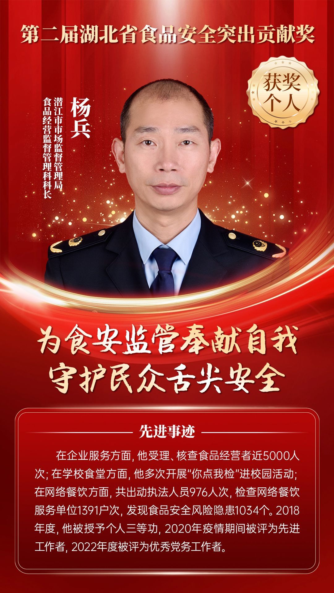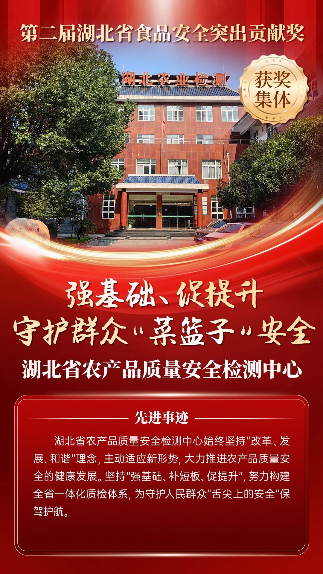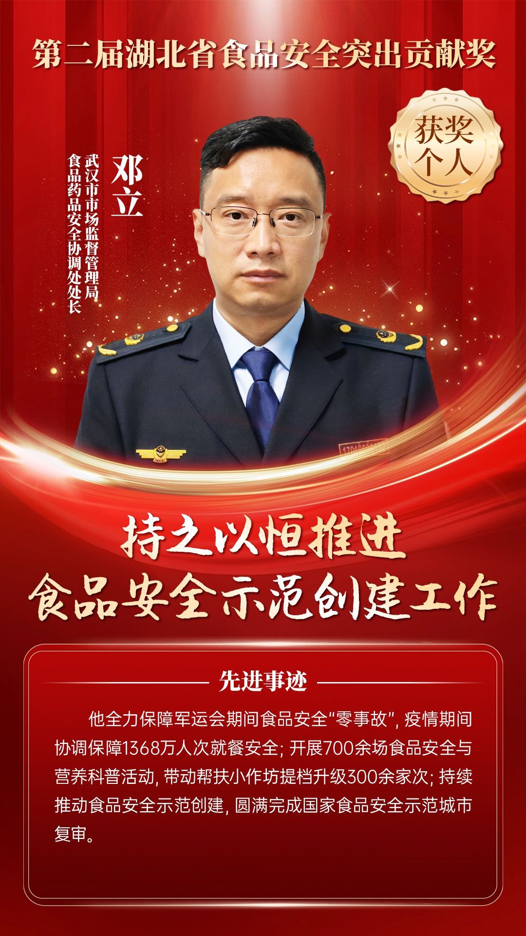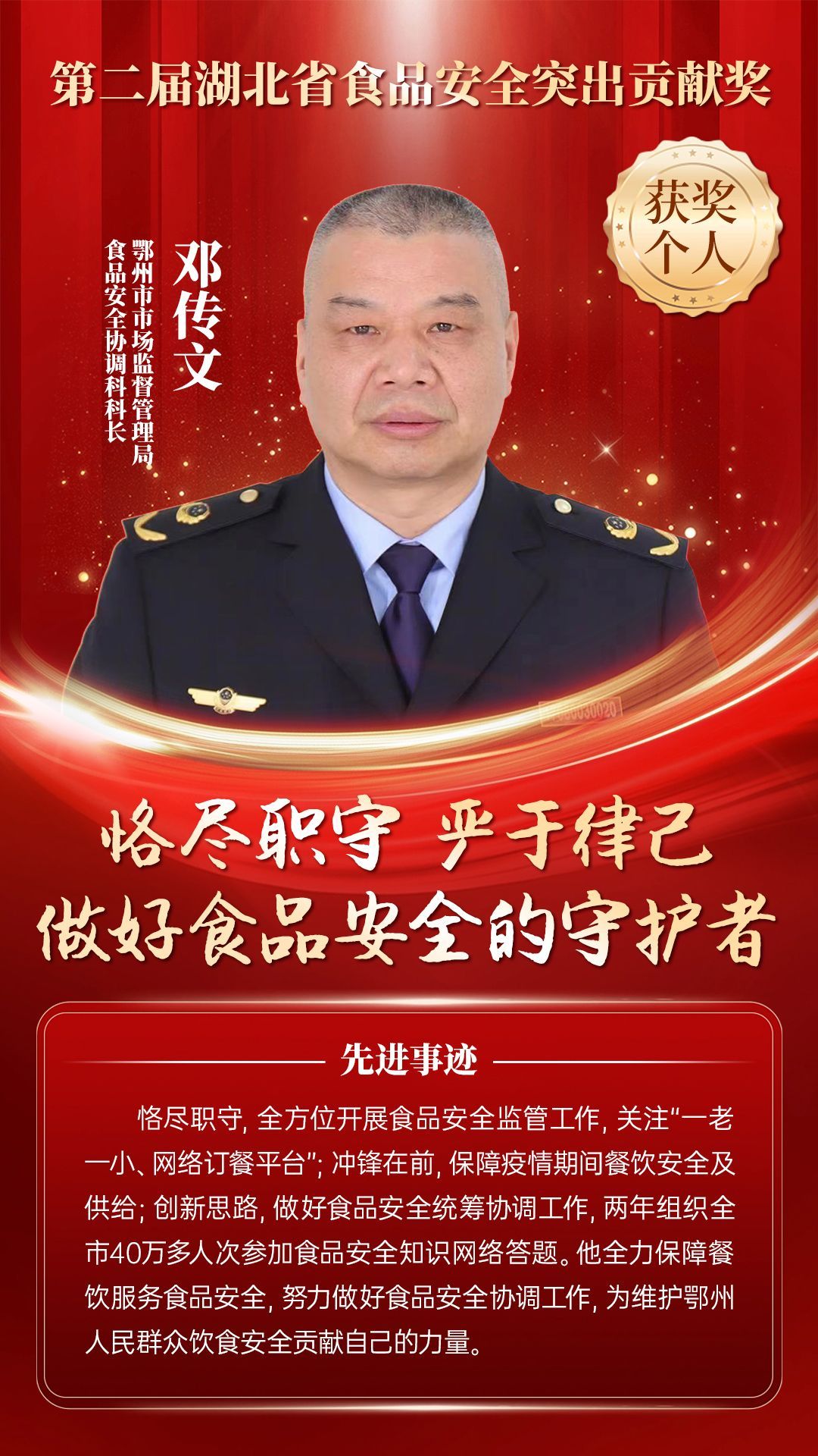 湖北省食品安全突出貢獻獎,是中央評先表彰辦公室批準的全國唯一一個以“食品安全”命名的省級政府獎,自2021年設立以來,每三年評選一次。該獎項主要面向食品安全工作基層一線,旨在表彰先進典型,激勵全省食品安全工作戰(zhàn)線開拓進取、勇于擔當、勤勉工作,不斷提高食品安全保障水平和治理能力,堅決筑牢食品安全底線,全力保障人民群眾“舌尖上的安全”。