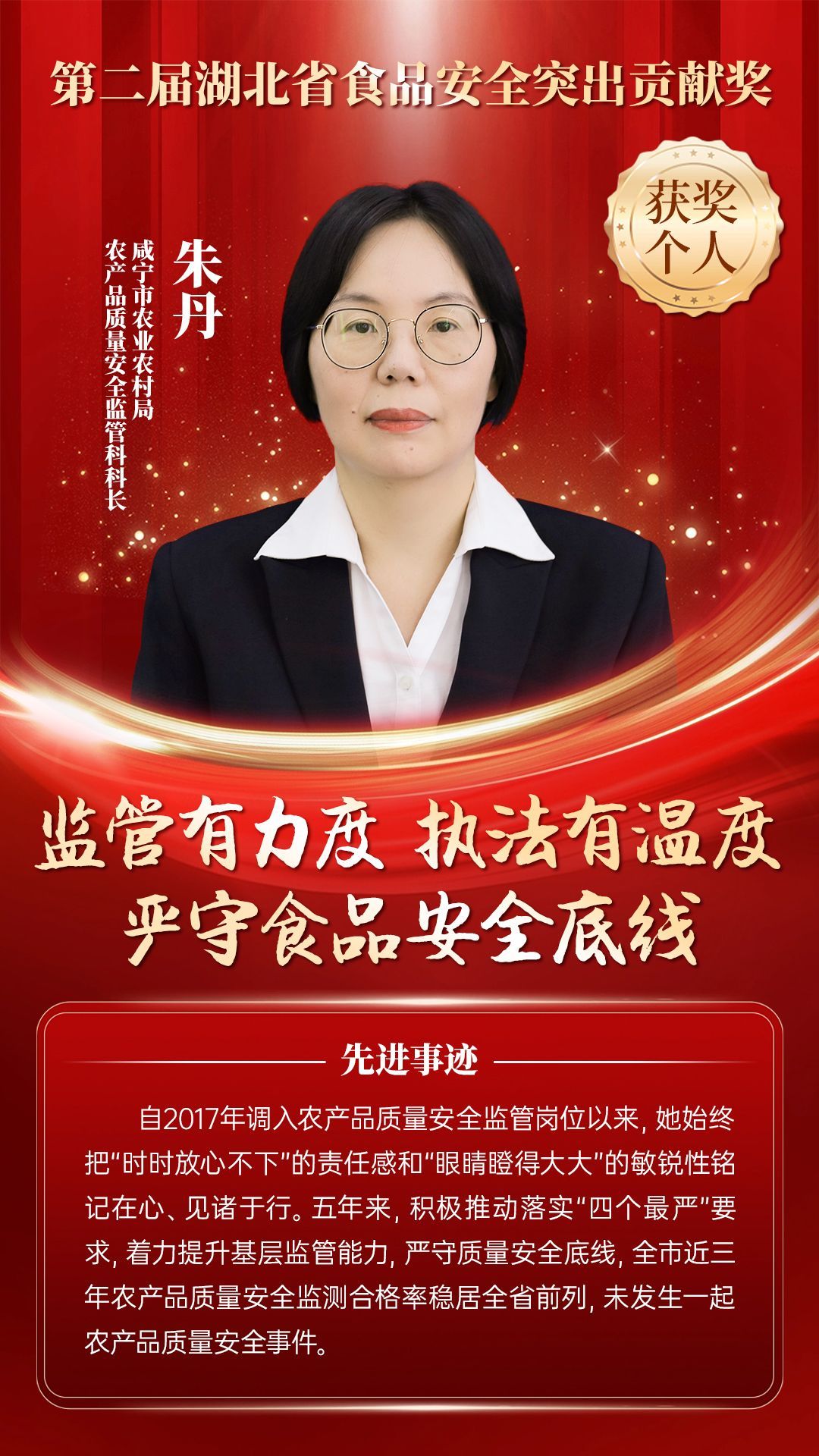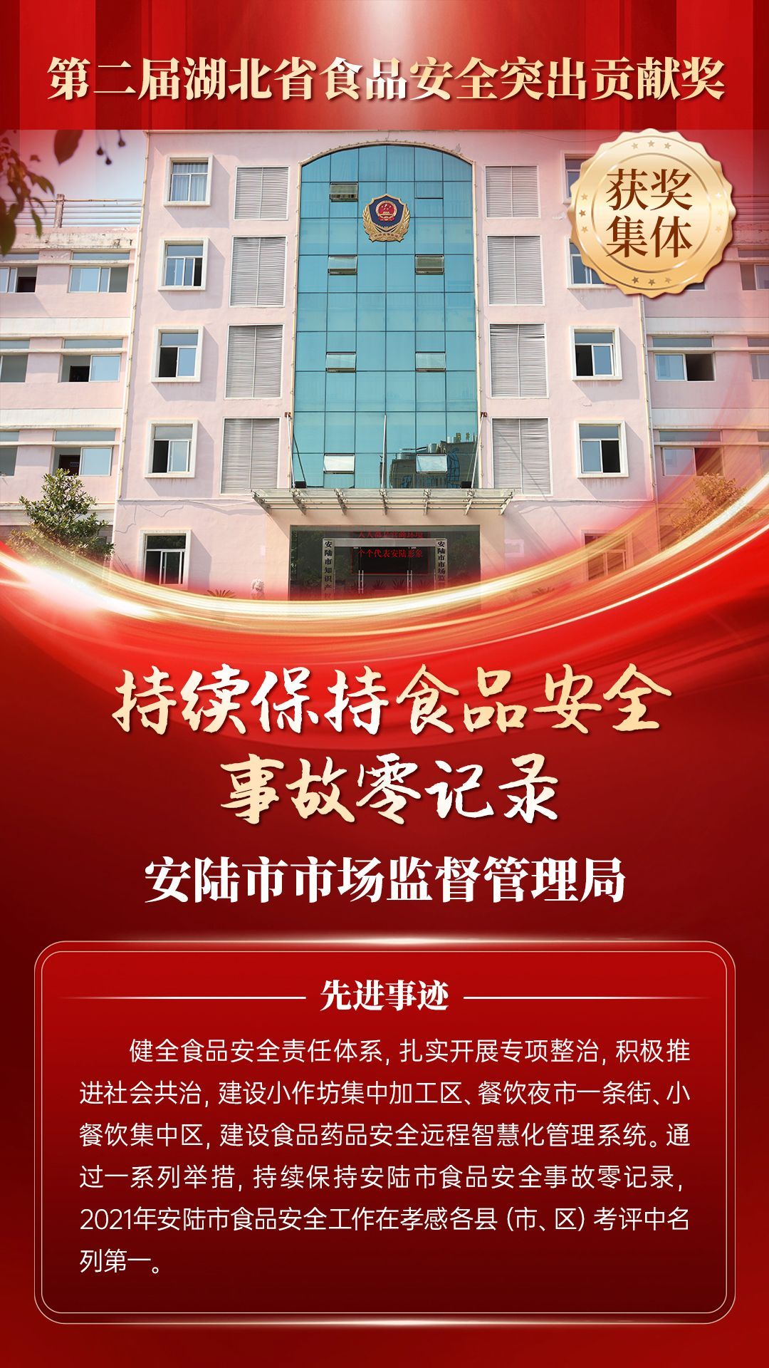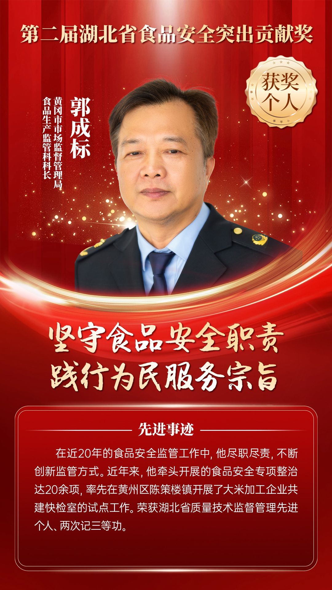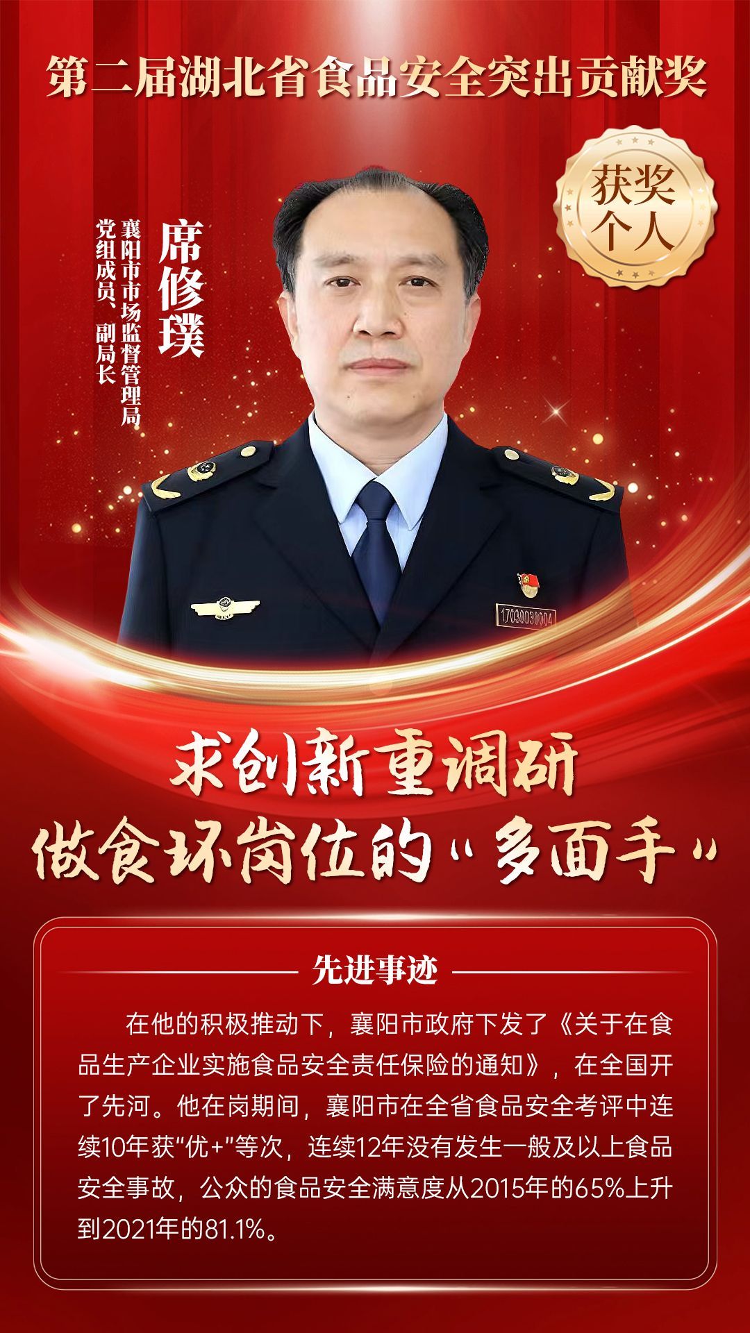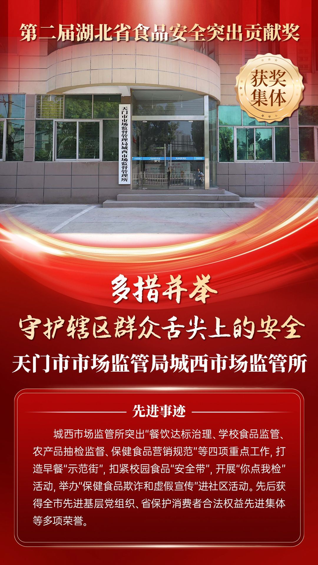 湖北省食品安全突出貢獻獎,是中央評先表彰辦公室批準的全國唯一一個以“食品安全”命名的省級政府獎,自2021年設立以來,每三年評選一次。該獎項主要面向食品安全工作基層一線,旨在表彰先進典型,激勵全省食品安全工作戰(zhàn)線開拓進取、勇于擔當、勤勉工作,不斷提高食品安全保障水平和治理能力,堅決筑牢食品安全底線,全力保障人民群眾“舌尖上的安全”。