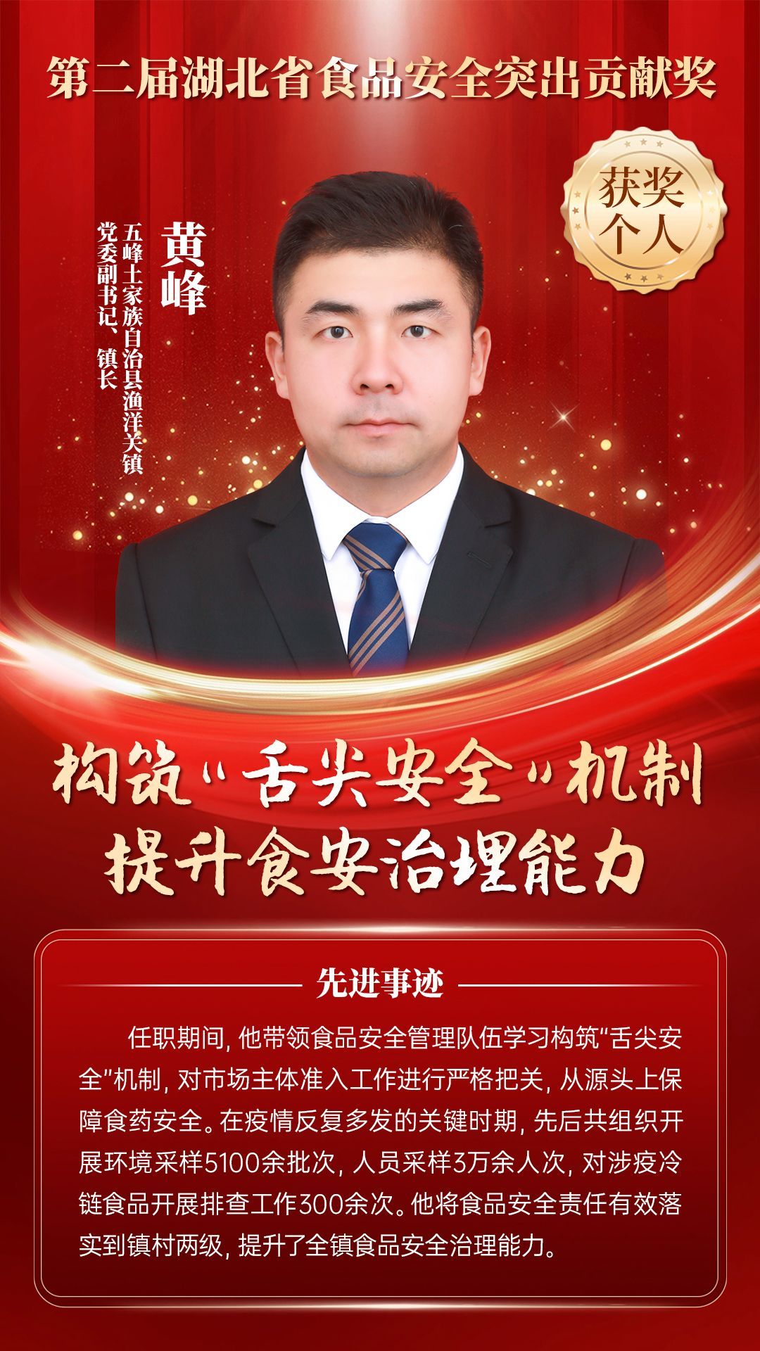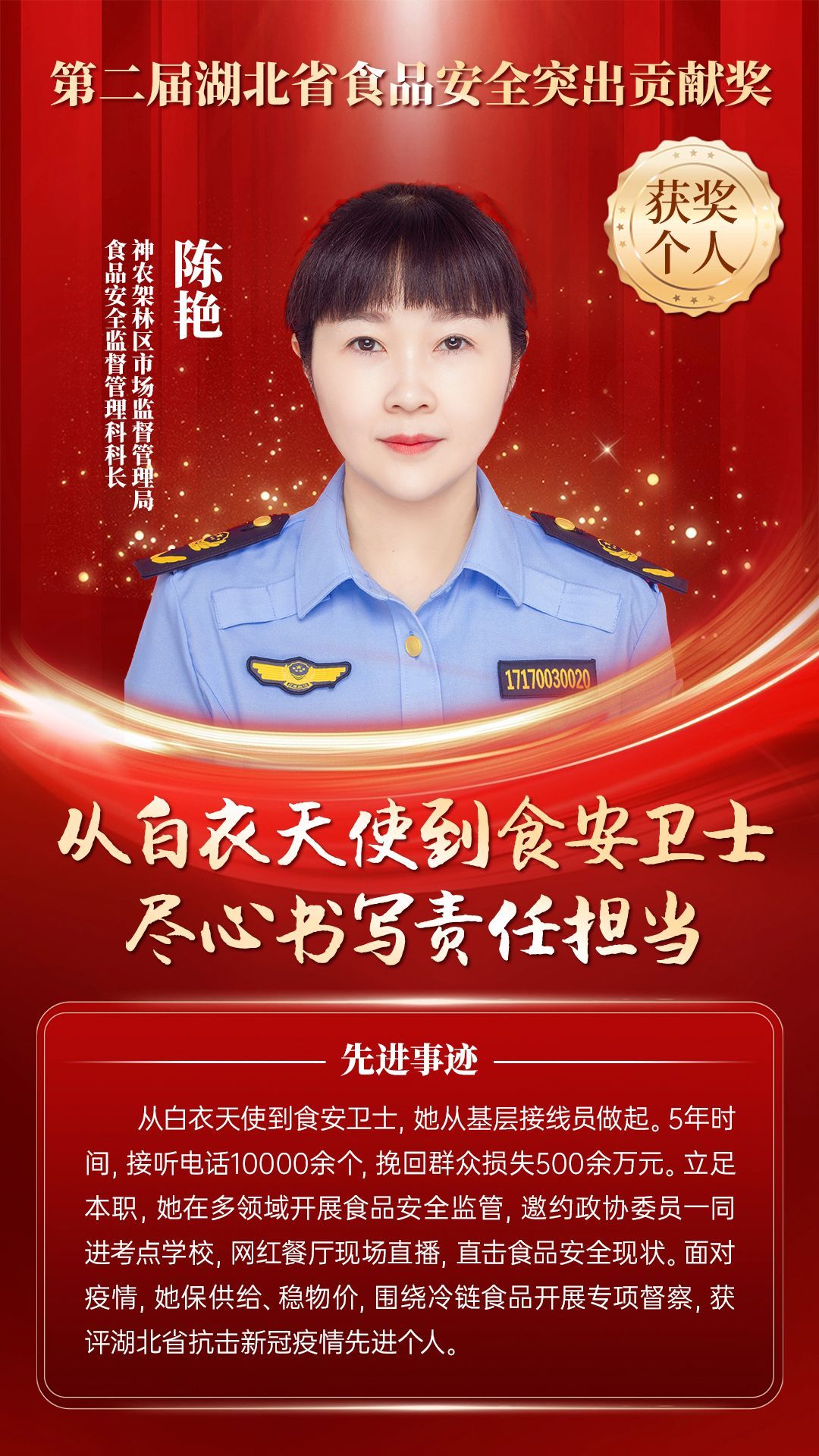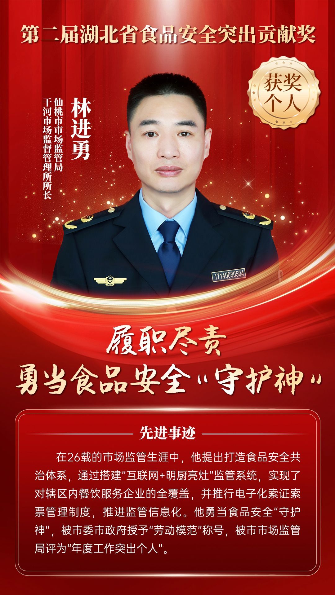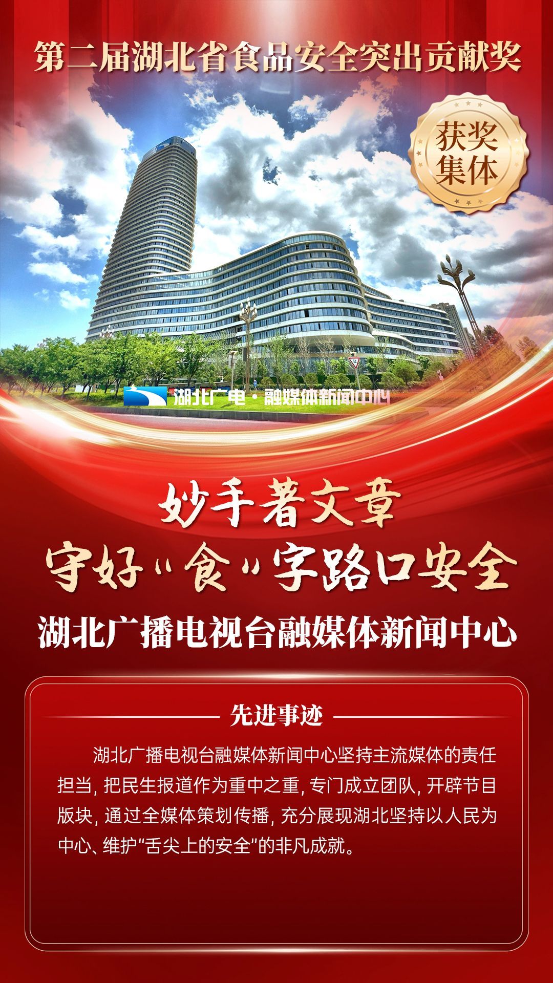 湖北省食品安全突出貢獻獎,是中央評先表彰辦公室批準的全國唯一一個以“食品安全”命名的省級政府獎,自2021年設立以來,每三年評選一次。該獎項主要面向食品安全工作基層一線,旨在表彰先進典型,激勵全省食品安全工作戰(zhàn)線開拓進取、勇于擔當、勤勉工作,不斷提高食品安全保障水平和治理能力,堅決筑牢食品安全底線,全力保障人民群眾“舌尖上的安全”。