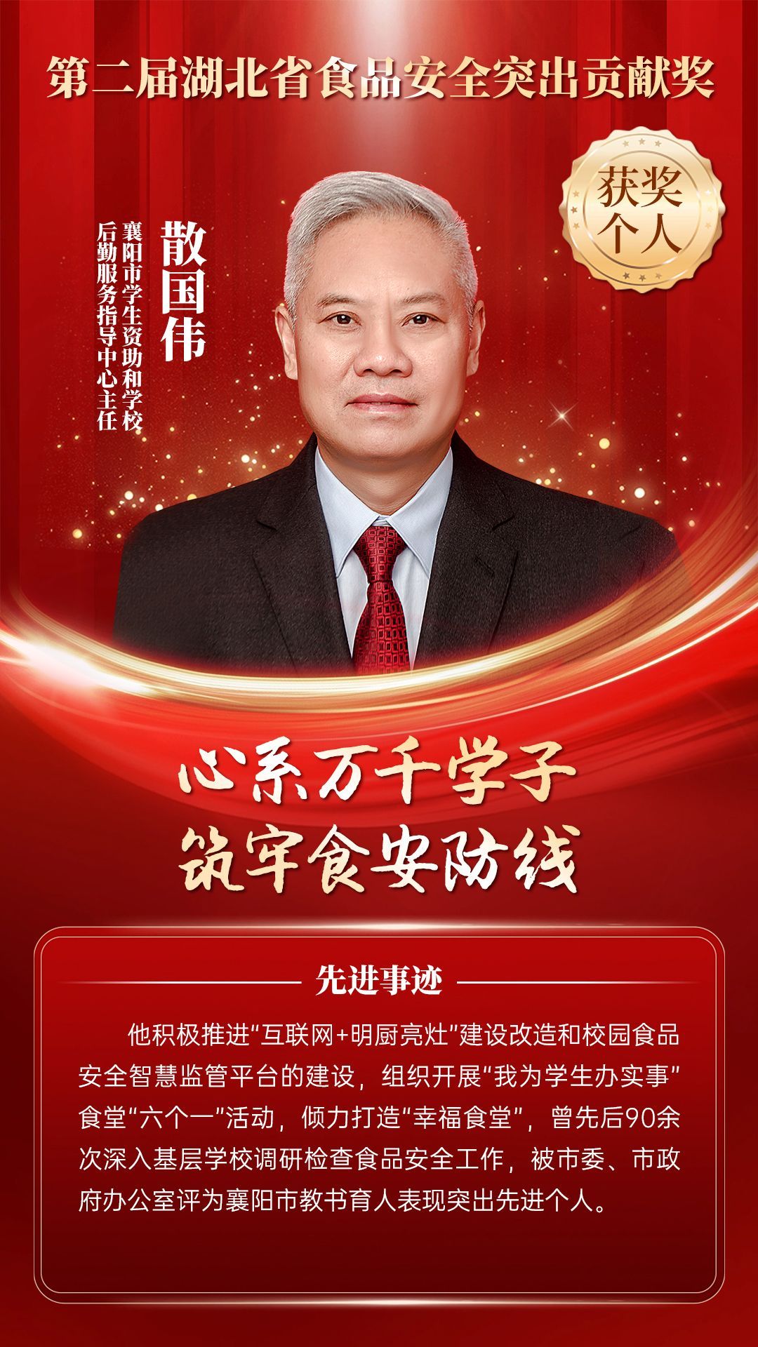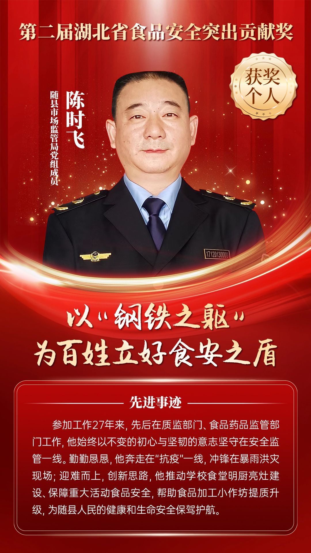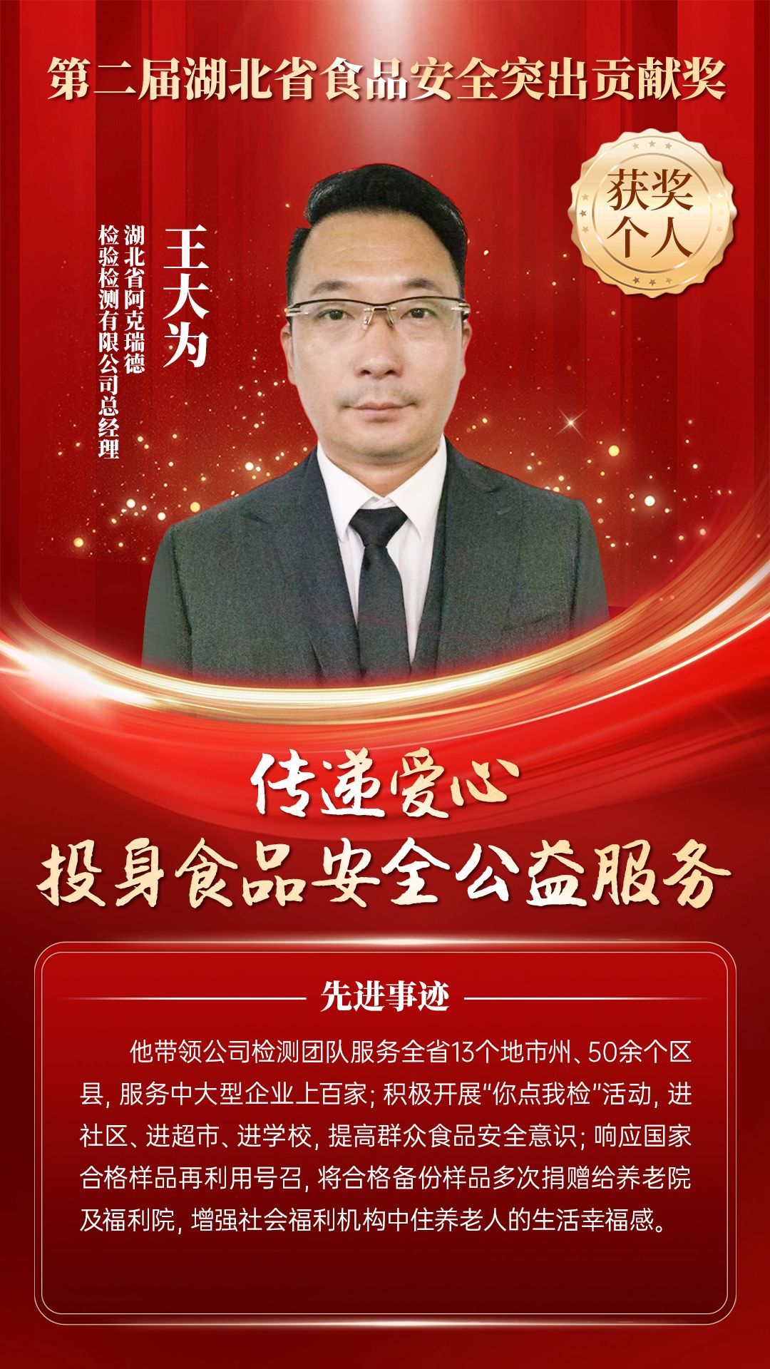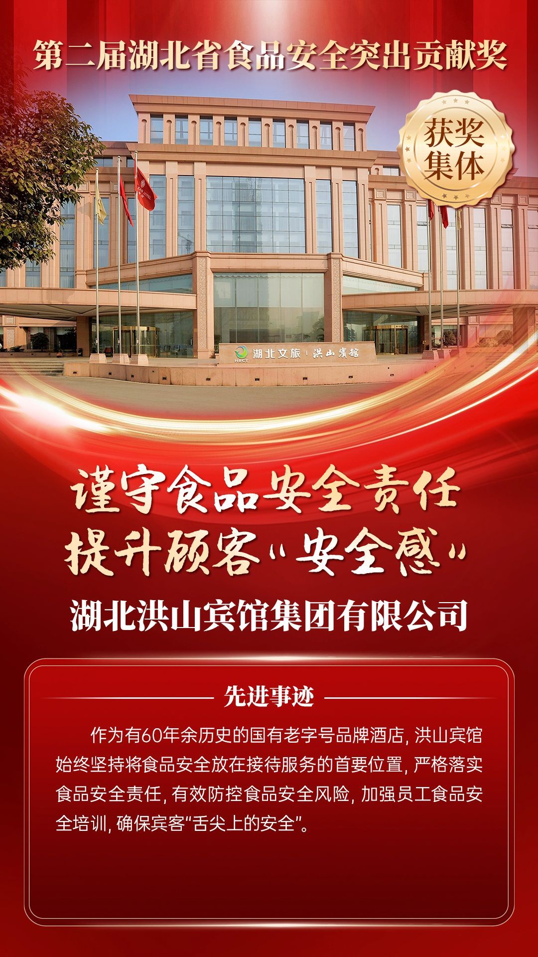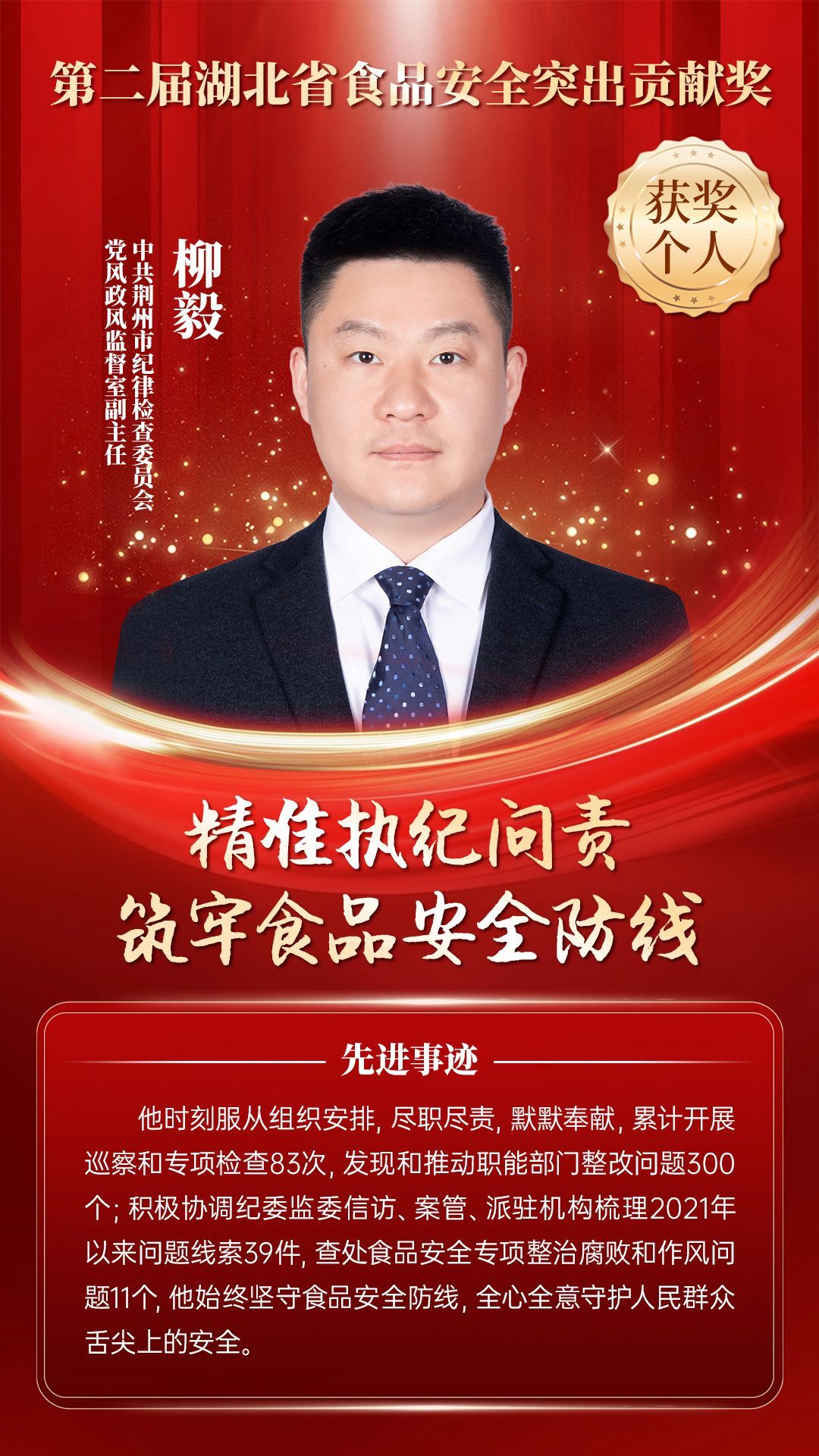 湖北省食品安全突出貢獻獎,是中央評先表彰辦公室批準的全國唯一一個以“食品安全”命名的省級政府獎,自2021年設立以來,每三年評選一次。該獎項主要面向食品安全工作基層一線,旨在表彰先進典型,激勵全省食品安全工作戰(zhàn)線開拓進取、勇于擔當、勤勉工作,不斷提高食品安全保障水平和治理能力,堅決筑牢食品安全底線,全力保障人民群眾“舌尖上的安全”。