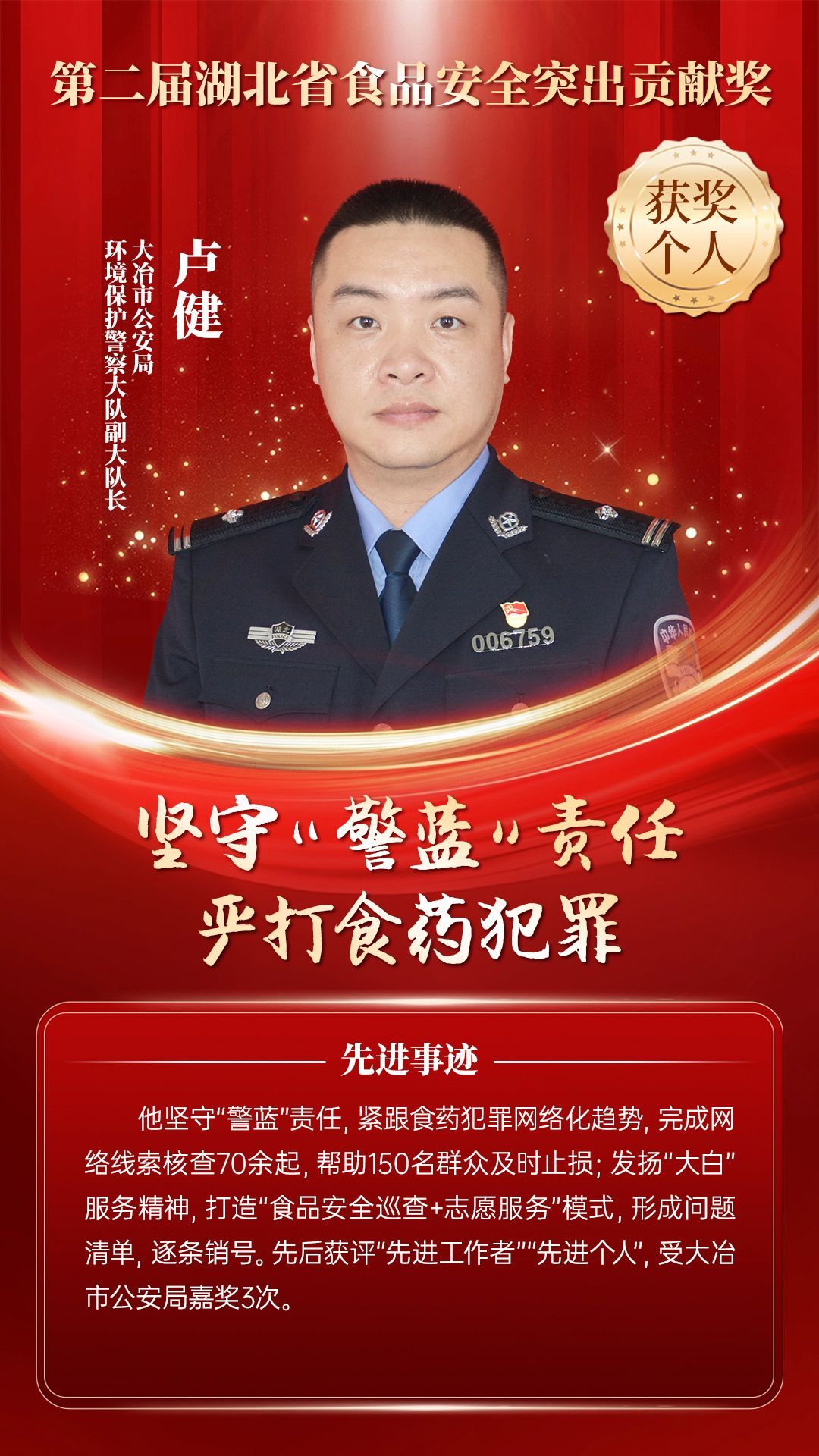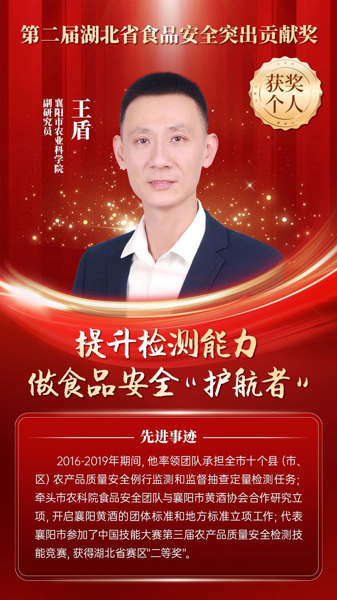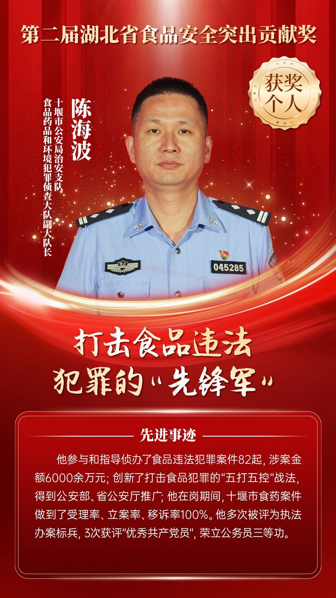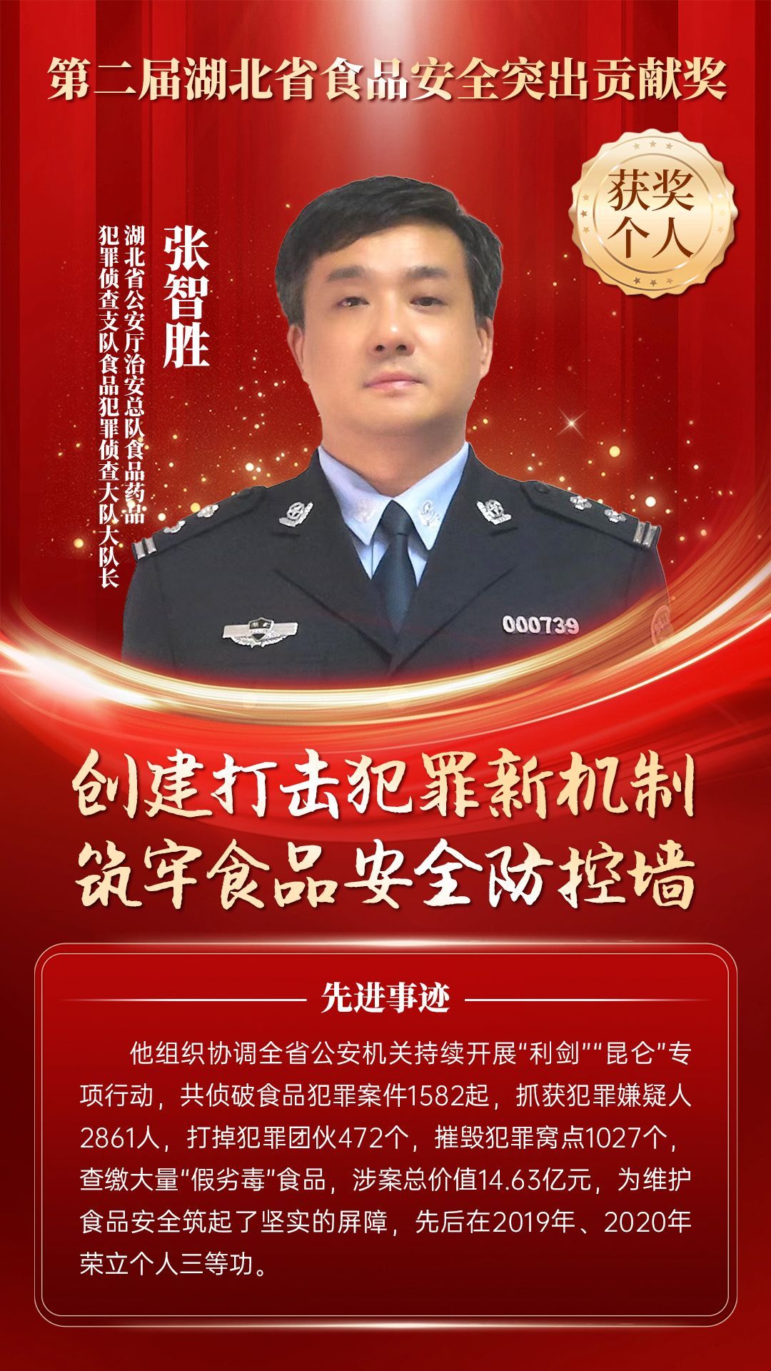 湖北省食品安全突出貢獻獎,是中央評先表彰辦公室批準的全國唯一一個以“食品安全”命名的省級政府獎,自2021年設立以來,每三年評選一次。該獎項主要面向食品安全工作基層一線,旨在表彰先進典型,激勵全省食品安全工作戰(zhàn)線開拓進取、勇于擔當、勤勉工作,不斷提高食品安全保障水平和治理能力,堅決筑牢食品安全底線,全力保障人民群眾“舌尖上的安全”。