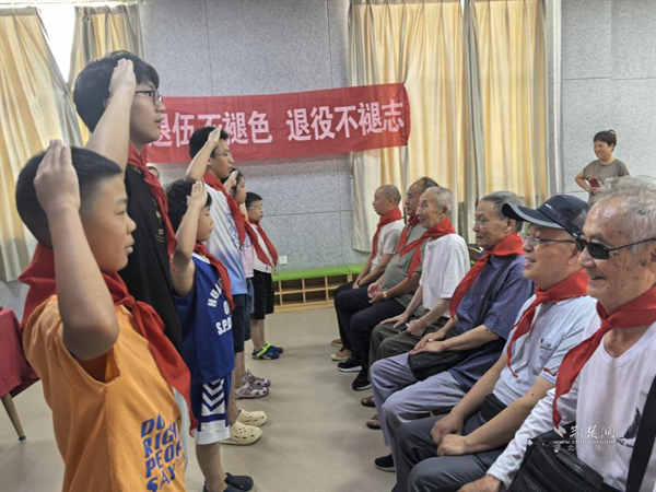 少年興則國家興,少年強(qiáng)則國家強(qiáng)。歐景苑社區(qū)開展“薪火傳承鑄軍魂,老少同堂慶八一”主題活動(dòng),青少年們與退役軍人歡聚一堂,共同觀看了紀(jì)錄片《為了和平》。少先隊(duì)員為退役老兵們系上鮮艷的紅領(lǐng)巾,并敬上隊(duì)禮。退役老兵代表戴三善分享了自己的從軍經(jīng)歷,孩子們聚精會(huì)神地聆聽著,心中升起對(duì)參軍的憧憬。