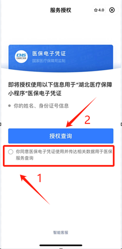 進(jìn)入到電子憑證授權(quán)頁面后,勾選“你同意電子醫(yī)保憑證使用并傳達(dá)相關(guān)數(shù)據(jù)用于醫(yī)保服務(wù)查詢”,并點(diǎn)擊“授權(quán)查詢”。
