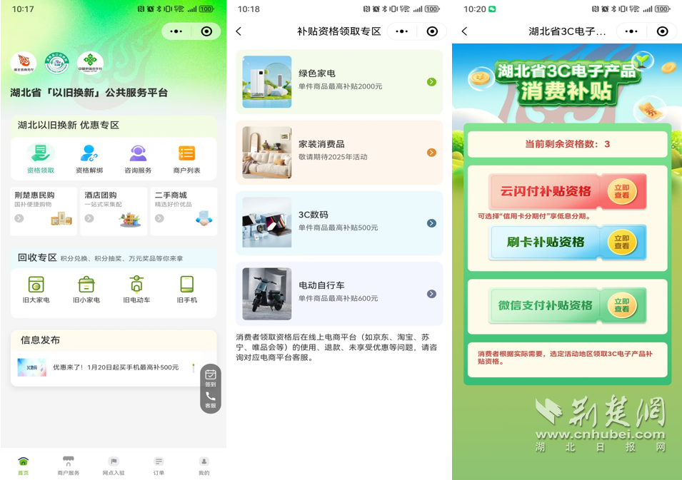 2、 選擇【3C數(shù)碼】,根據(jù)支付習慣領取補貼資格。選擇對應支付渠道—提示彈框確認—進入3C電子產(chǎn)品補貼資格頁面—選擇對應商品領取資格,并可查看活動規(guī)則提示。