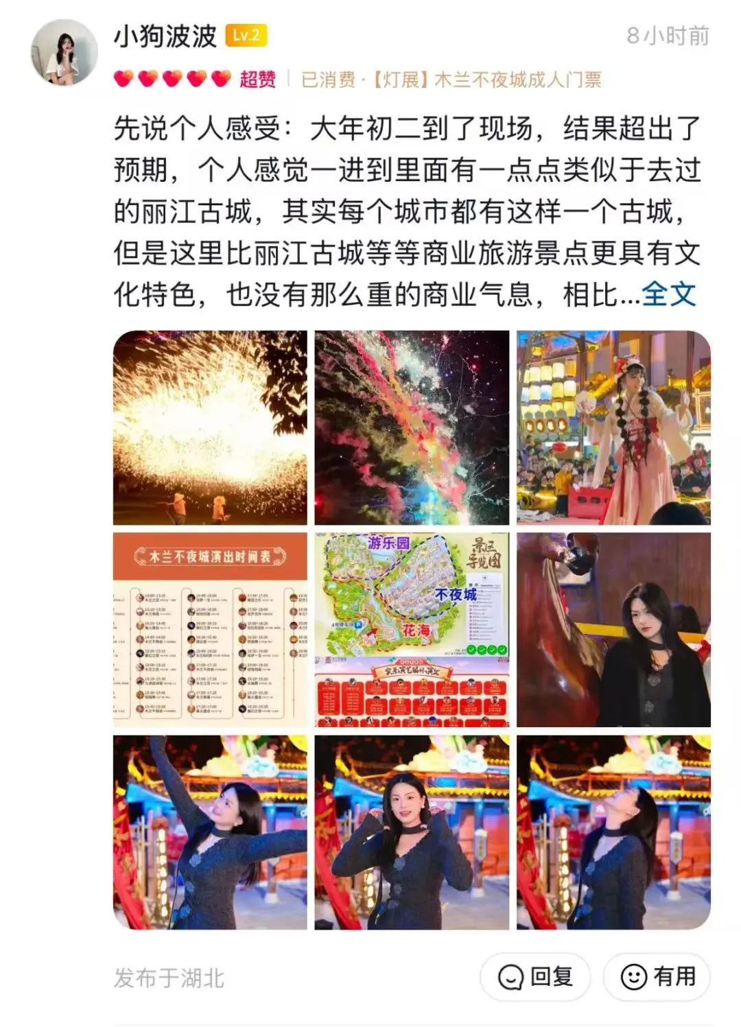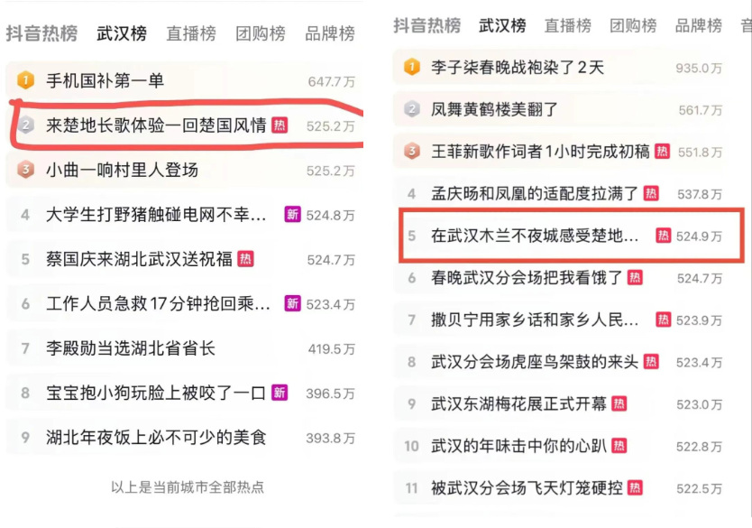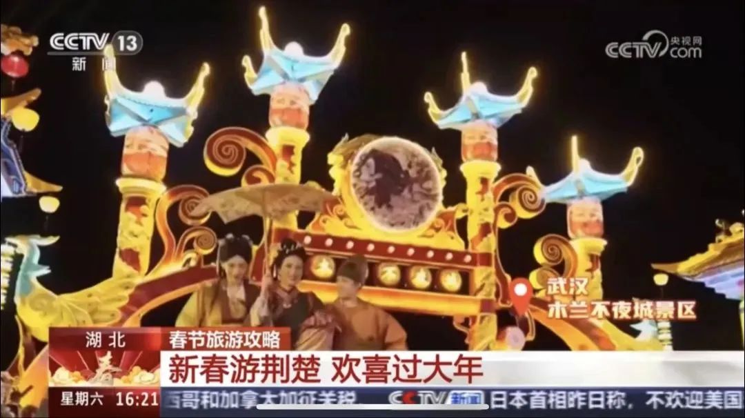 2月1日,央視新聞直播間欄目以《新春游荊楚,歡喜過(guò)大年》為題,聚焦湖北武漢鄉(xiāng)村游。解說(shuō)詞說(shuō)道:“武漢木蘭不夜城景區(qū),是以沉浸式夜游和木蘭文化實(shí)景演出為特色的旅游景區(qū)。春節(jié)假期,除了賞燈會(huì)、看民俗,木蘭不夜城全新打造的沉浸式劇場(chǎng)《楚地長(zhǎng)歌》,為游客帶來(lái)更多元化的沉浸式打卡體驗(yàn)”。