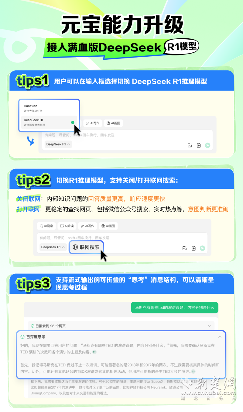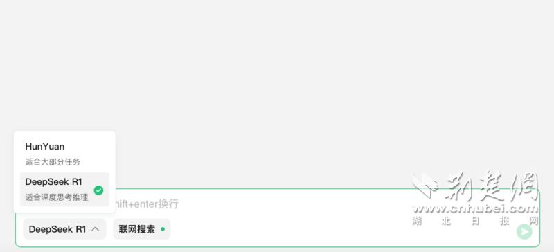 荊楚網(wǎng)(湖北日報網(wǎng))訊(通訊員 袁軒)2月13日,騰訊AI助手“騰訊元寶”迎來重大更新,同時支持混元和DeepSeek兩大模型,打開騰訊元寶并進(jìn)入對話界面,即可免費(fèi)使用DeepSeek-R1滿血版模型。