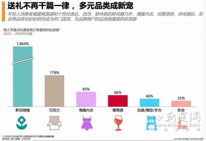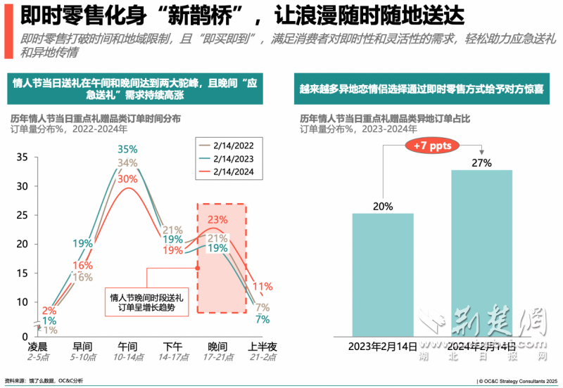 荊楚網(wǎng)(湖北日報網(wǎng))訊(通訊員 易曄)元宵才過,情人節(jié)接檔。零售品牌商戶們毫不猶豫步入下一個生意高峰,過節(jié)的愛人們也不慌不忙在節(jié)日當(dāng)天開始籌備浪漫表達。近日,餓了么聯(lián)合戰(zhàn)略咨詢公司OC&C共同發(fā)布的《情人節(jié)即時零售禮贈趨勢與品類機遇洞察》顯示,過去三年情人節(jié)當(dāng)天,重點禮贈品類的外賣單量較12日環(huán)比增長超過3倍,且當(dāng)日送禮訂單在晚間(17-21點)需求持續(xù)增長。