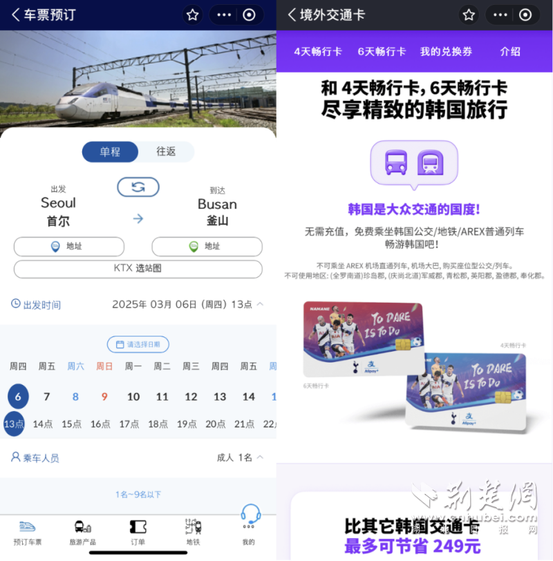 赴韓游客上支付寶可查詢韓國(guó)火車的車次并選座買票,還能買更實(shí)惠的暢行交通卡。通訊員供圖