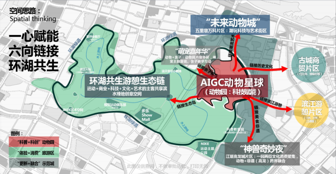 漢陽區(qū)文旅局發(fā)布環(huán)動物園文旅圈產(chǎn)業(yè)規(guī)劃,動物園片區(qū)擬圍繞“親子、運(yùn)動、創(chuàng)意”三大主題詞,通過數(shù)游賦能、延鏈補(bǔ)空、引線搭橋,整合區(qū)域商文旅資源,打造“科普+科創(chuàng)”動物園、“體驗(yàn)+消費(fèi)”旅游區(qū)、“更新+融合”示范區(qū),形成“一心賦能、六向鏈接、環(huán)湖共生”的空間規(guī)劃思路。圍繞動物園提升打造AIGC動物星球,圍繞水路交通串聯(lián),豐富創(chuàng)意體驗(yàn)空間,形成環(huán)湖共生游憩生態(tài)鏈。讓環(huán)動物園文旅圈形成“以文旅帶流量、以場景促產(chǎn)業(yè)”的引領(lǐng)效應(yīng)。