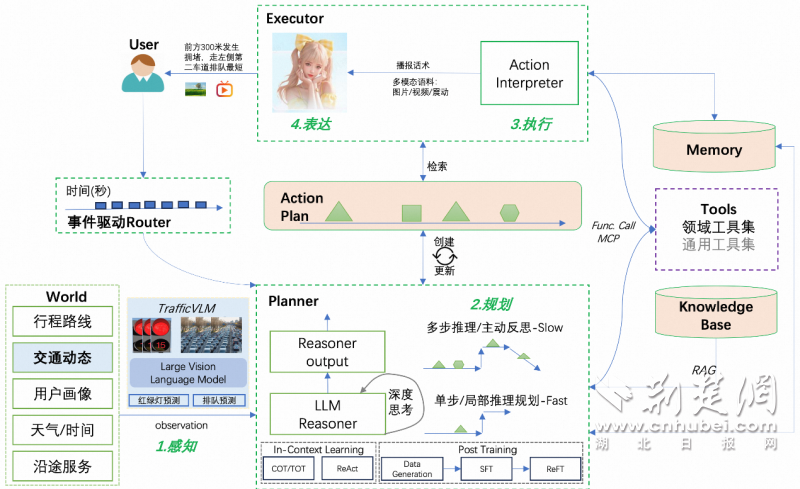 據(jù)技術(shù)負(fù)責(zé)人介紹,其核心架構(gòu)采用Planner-Executor模式,通過感知、規(guī)劃、執(zhí)行、表達(dá)四大模塊構(gòu)建智能閉環(huán),集成多項(xiàng)高德核心技術(shù):在感知層,TrafficVLM模型可捕捉多尺度的交通時(shí)空變化, 而交互層的AmapVoice情感語音技術(shù),則將溫度賦予導(dǎo)航產(chǎn)品。