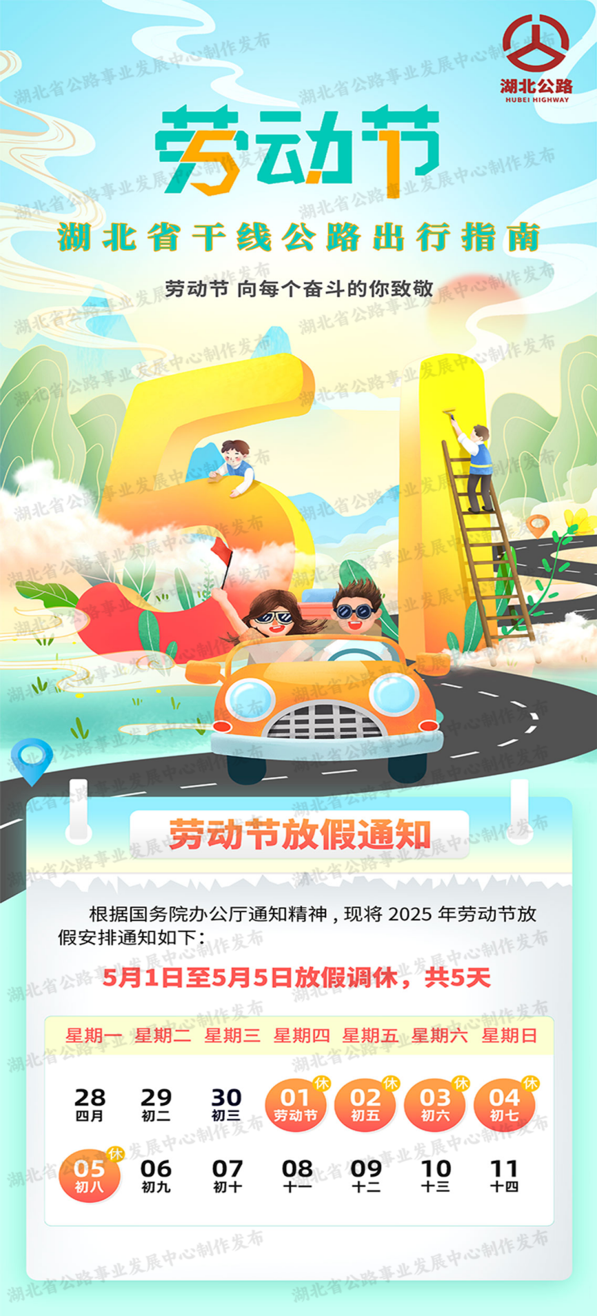 湖北省公路事業(yè)發(fā)展中心根據(jù)歷年來勞動節(jié)假期全省公路網(wǎng)運行監(jiān)測情況,提前分析研判2025年勞動節(jié)假期路網(wǎng)運行態(tài)勢,預計勞動節(jié)假期期間公路網(wǎng)流量較日常漲幅明顯,出行需求以踏青出游、探親訪友等中短途自駕出行為主,省內(nèi)各市州周邊路段和通往知名景區(qū)路段的交通流量大幅增長,武漢市及其他重點城市周邊路段易出現(xiàn)擁堵緩行?,F(xiàn)編制《2025年勞動節(jié)假期湖北省干線公路出行指南》,為公眾平安便捷出行提供參考。