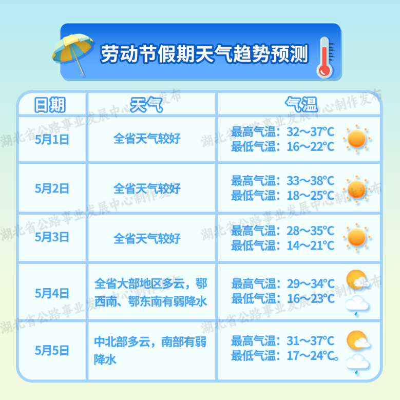 湖北省公路事業(yè)發(fā)展中心經(jīng)與省氣象服務中心會商研判,預計今年勞動節(jié)小長假期間(5月1日—5日),我省前晴后雨,氣溫變化平穩(wěn),溫度適宜,天氣條件總體利于出行。其中,5月1日—3日全省天氣較好;4日大部地區(qū)多云,鄂西南、鄂東南有弱降水;5日中北部多云,南部有弱降水。