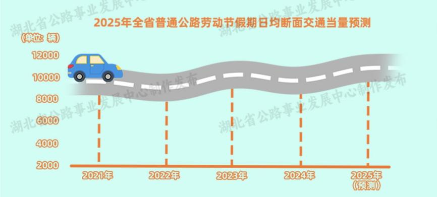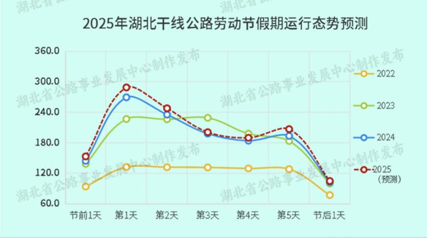 湖北省公路事業(yè)發(fā)展中心根據(jù)歷年路網(wǎng)運行數(shù)據(jù)分析,結(jié)合假期全省路網(wǎng)天氣預測以及近期車流量等運行實際,預計勞動節(jié)假期期間高速路網(wǎng)通行車輛流量為近期平日日均流量的2.14倍,較2024年勞動節(jié)假期日均流量同比增長約5%。