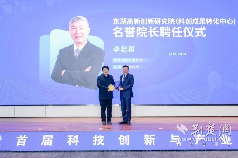 中國工程院院士李培根獲聘東湖高新創(chuàng)新研究院名譽院長,劉俊剛為東湖高新創(chuàng)新研究院專家頒發(fā)聘書。