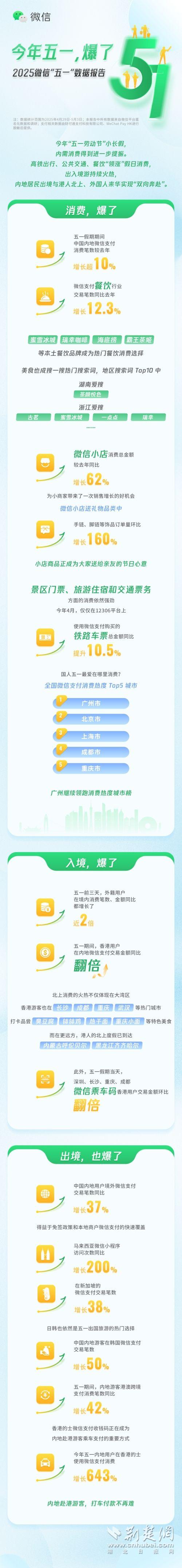 同時,外國人來華、港人北上同樣火熱。微信支付外卡數(shù)據(jù)顯示,今年五一前三天,外籍用戶在境內(nèi)消費筆數(shù)、金額同比都增長了近2倍。