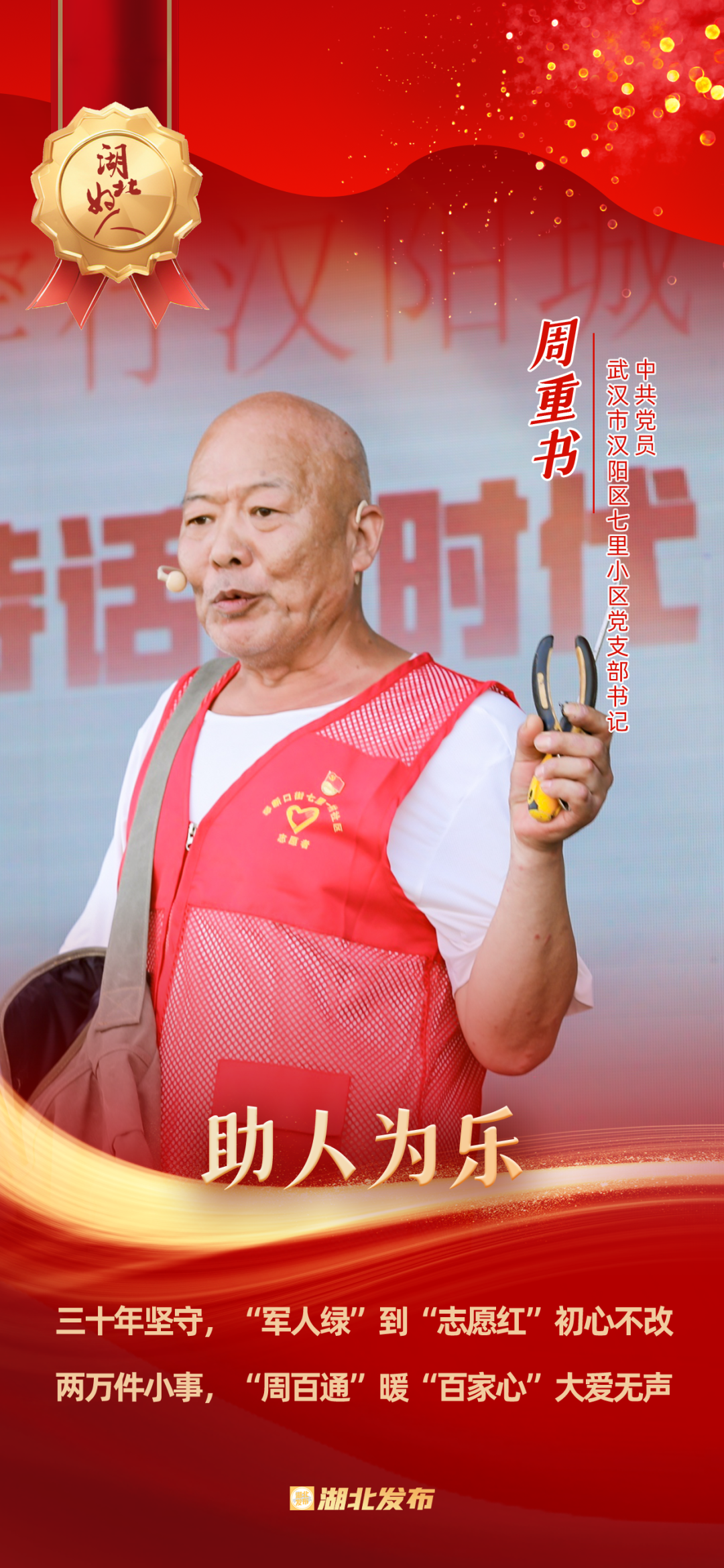 1973年在部隊(duì)入黨,1976年轉(zhuǎn)業(yè)到武漢家具廠,2009年被選為社區(qū)黨委委員,2023年榮獲“武漢楷模”稱號(hào)……今年75歲的周重書是一名退伍老黨員,在部隊(duì)曾兩次榮立三等功,在工廠也多次被評(píng)為先進(jìn)工作者和模范標(biāo)兵。