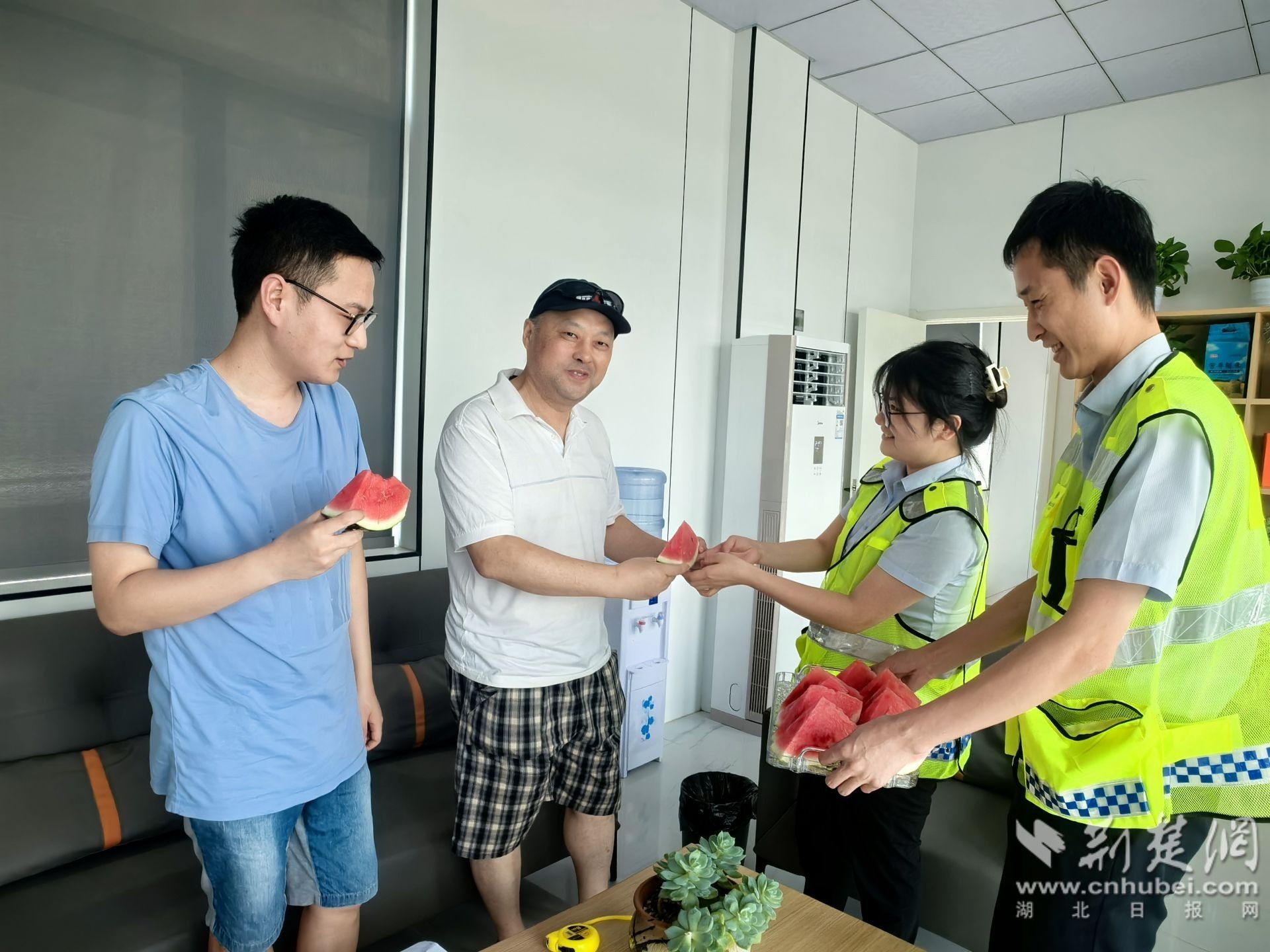 “師傅,快吃塊冰鎮(zhèn)西瓜降降溫!”8月4日14時12分,大悟北收費(fèi)站旁的愛心小屋里,志愿者將清涼遞到風(fēng)塵仆仆的司機(jī)手中。這處防暑服務(wù)點(diǎn)雖小,卻是高溫旅途的庇護(hù)所:冰爽西瓜、清涼飲水、片刻陰涼,幫助司乘補(bǔ)充水分、消散暑氣。來自河南的王師傅感慨:“高溫天開車易脫水犯困,能在這歇腳降溫,太及時了!”入夏以來,該點(diǎn)已為超百名經(jīng)受高溫“烤”驗(yàn)的司乘提供防暑關(guān)懷,成為高速路上的“清涼驛站”。