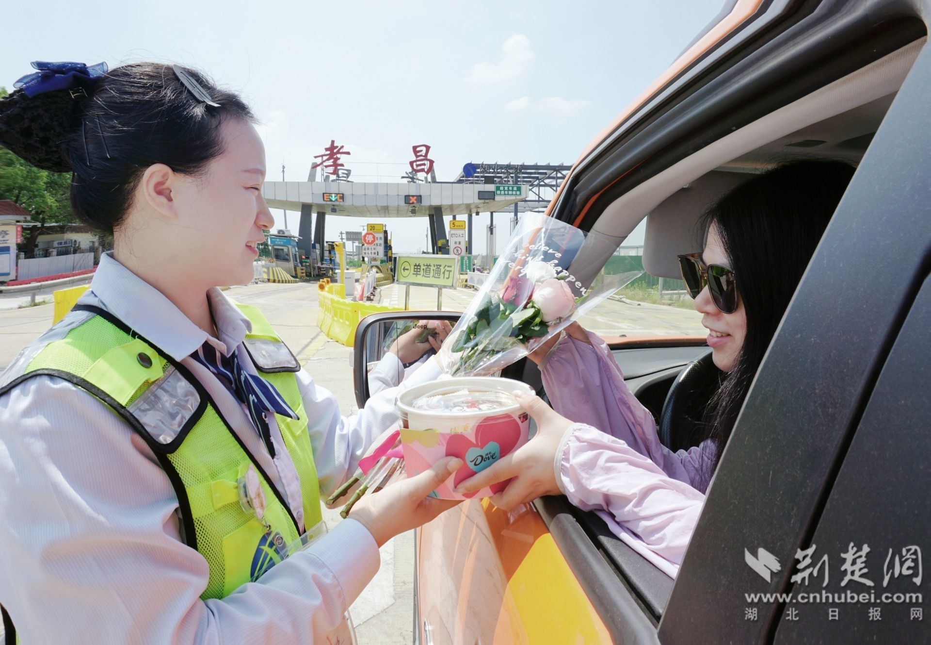 “您好,七夕快樂!”“祝您旅途愉快!”節(jié)日當(dāng)天,工作人員手持嬌艷的玫瑰花和精美的巧克力,為過往司乘送上節(jié)日驚喜。一位正準(zhǔn)備趕赴約會的車主開心地表示:“沒想到在高速路口還能收到這么用心的禮物,頓時覺得這一路特別浪漫!”收費窗口成為傳遞溫情的紐帶。