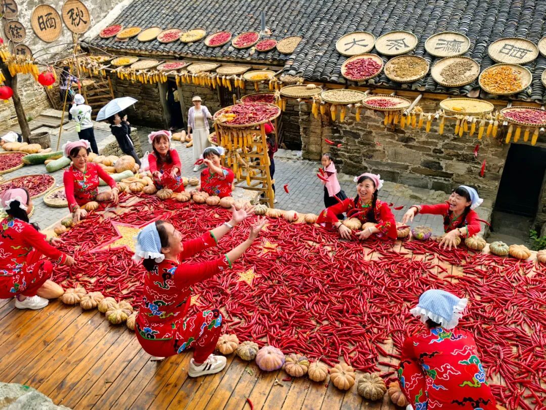 在大余灣,曬秋是鐫刻在石墻黛瓦間的詩意。簸箕托起整個(gè)秋天的饋贈(zèng)——火紅的辣椒、金黃的玉米、橙黃的南瓜、褐色的板栗……層層疊疊鋪展在檐下、院中、屋頂,與明清時(shí)期的古建筑交相輝映,潑灑出中國(guó)最生動(dòng)的秋日油畫。