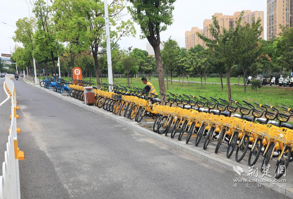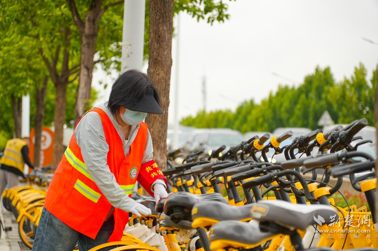 武漢輕工大學學生志愿者參與單車擺放。