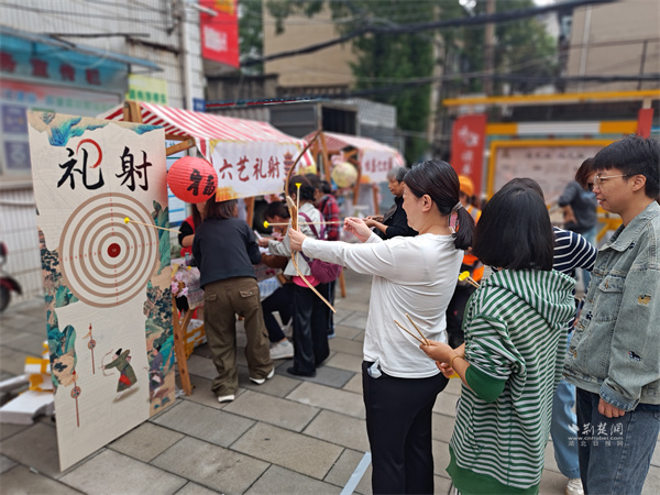 游戲互動區(qū)氛圍熱烈?!吧涓膊轮i”攤位前,居民踴躍參與,猜中謎底者可獲贈汪玉霞蘇月餅;“投壺納?!蔽娙艘辉嚿硎郑谌の吨懈惺芄哦Y韻味;“福來套圈”則準(zhǔn)備了洗衣液、透明皂等實(shí)用獎品,深受居民喜愛。此外,“六藝禮射”項(xiàng)目讓居民親身體驗(yàn)傳統(tǒng)射藝,在拉弓搭箭間感受古人的尚武精神與禮儀風(fēng)范。