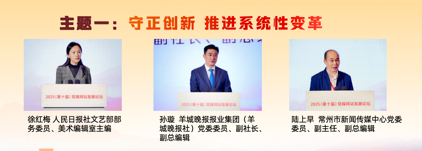 在“守正創(chuàng)新 推進(jìn)系統(tǒng)性變革”主題研討環(huán)節(jié),人民日?qǐng)?bào)社文藝部部務(wù)委員、美術(shù)編輯室主編徐紅梅,羊城晚報(bào)報(bào)業(yè)集團(tuán)(羊城晚報(bào)社)黨委委員、副社長、副總編輯孫璇,常州市新聞傳媒中心黨委委員、副主任、副總編輯陸上早分別作主旨發(fā)言,介紹了各自領(lǐng)域推進(jìn)系統(tǒng)性變革、發(fā)展新時(shí)代中國特色社會(huì)主義文化的實(shí)踐與探索。徐紅梅表示,“每日讀畫”采取“AI+美術(shù)”“微視頻+夜讀”的形式,堅(jiān)持“讀準(zhǔn)、讀細(xì)、讀新、讀美”,讓AI成為深入畫境、開啟古今對(duì)話的共創(chuàng)者,以動(dòng)態(tài)轉(zhuǎn)譯、意境擴(kuò)展、流程再造、視聽融合開發(fā)美術(shù)融媒的敘事潛能,深入挖掘中華文明賡續(xù)傳承的基因密碼,成為探索主流媒體系統(tǒng)性變革的微觀樣本。孫璇表示,羊城晚報(bào)全面啟動(dòng)系統(tǒng)性變革,以做強(qiáng)媒體、文化、數(shù)據(jù)、產(chǎn)業(yè)四個(gè)戰(zhàn)略板塊為重點(diǎn),把“技術(shù)賦能”嵌入系統(tǒng)性變革各關(guān)鍵板塊,積極增強(qiáng)文化傳播、促進(jìn)文化交流和繁榮文化生產(chǎn)。陸上早表示,常州借“蘇超”東風(fēng),走出城市轉(zhuǎn)型與能級(jí)躍升之路。改革的推進(jìn)需聚焦六大方向:組織體系化,內(nèi)容精品化,傳播移動(dòng)化,技術(shù)現(xiàn)代化,分配績效化,干部年輕化。