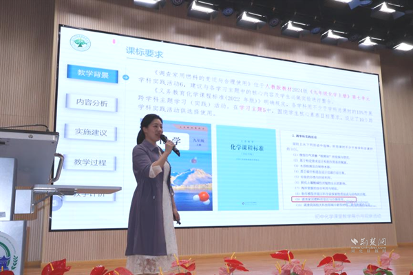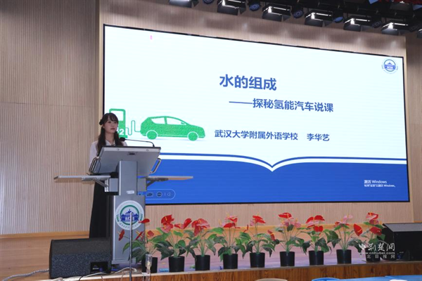武漢大學附屬外語學校李華藝老師執(zhí)教《水的組成——探秘氫能汽車》展示課。課程以新能源汽車為線索,設計四大項目,學生通過海報、角色扮演等形式展示探究成果。李老師引導學生從宏觀、微觀、符號三重視角認識水的組成,最終用電解產生的氫能讓小車現場行駛,實現化學與科技的有機融合。說課環(huán)節(jié)中,她介紹項目圍繞“氫能汽車如何工作”展開,借助AI模擬生產過程,讓學生感受化學的實踐價值。