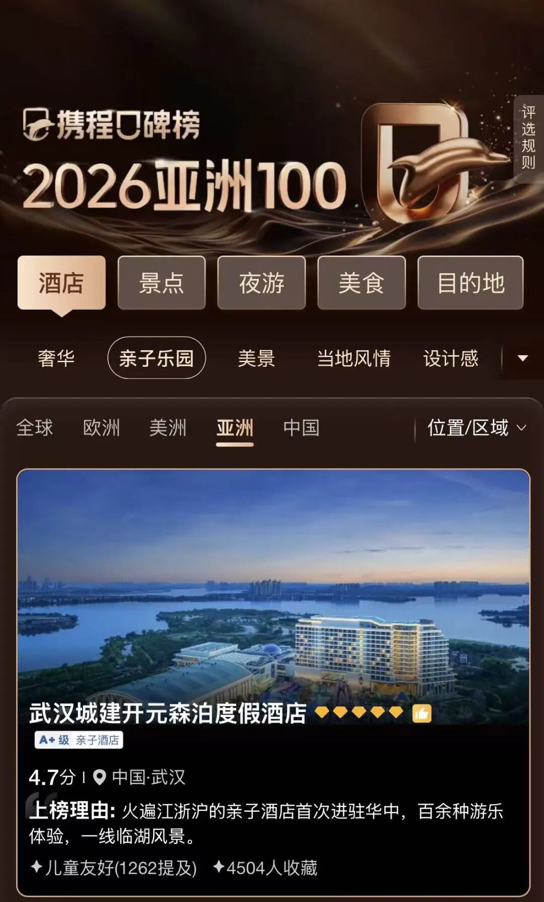 近日,攜程平臺(tái)發(fā)布《攜程口碑榜2026年度榜單》,武漢城建開(kāi)元森泊度假酒店成功上榜亞洲親子樂(lè)園酒店百?gòu)?qiáng),位列亞洲第58位、國(guó)內(nèi)第29位,成為湖北省唯一上榜的酒店。