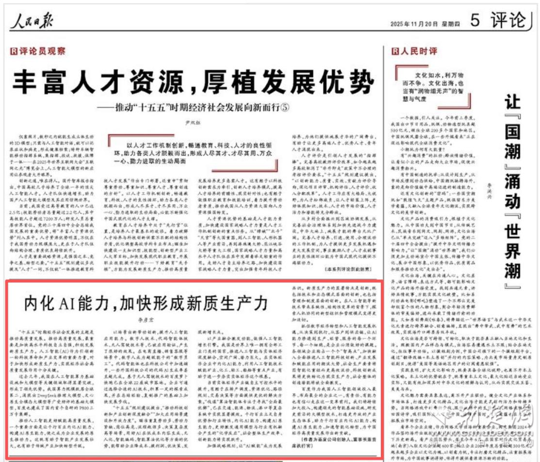 荊楚網(湖北日報網)訊(通訊員 杜軒)11月20日,百度創(chuàng)始人、董事長兼首席執(zhí)行官李彥宏在《人民日報》發(fā)表題為《內化AI能力,加快形成新質生產力》的署名文章。他指出,推動人工智能更好賦能高質量發(fā)展,一個重要方面是讓千行百業(yè)內化AI能力,構建AI原生能力,使之成為企業(yè)發(fā)展的原生推動力。