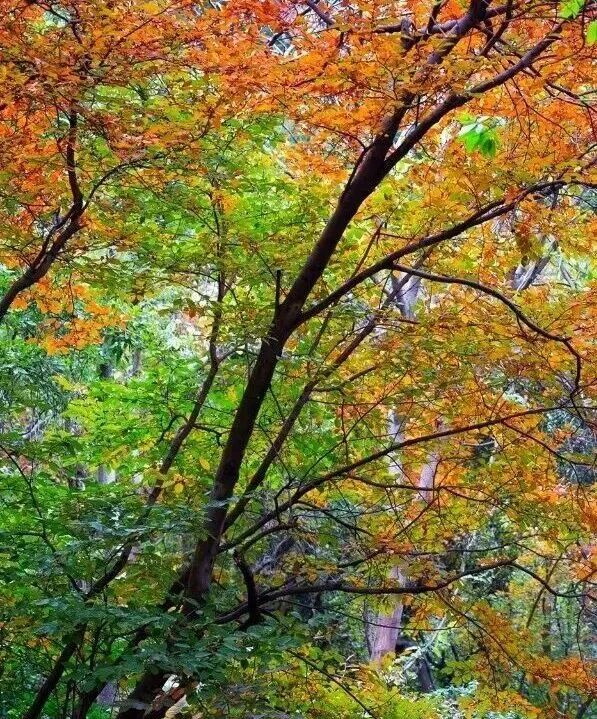 綿延的山谷像打翻的調(diào)色盤,紅色是主調(diào),其間點綴著金、橙和綠色,錯落有致,構(gòu)成一幅溫暖的秋景長卷。